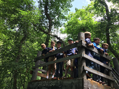 The boys did all kinds of things at camp including: rock climbing, go-cart racing, crafting a bow tie, making a light saber, designing a simple machine and creating a stick bomb, analyzing fingerprints, looking for forensic clues, shooting BB guns, participating in a camp fire program, climbing up a tree house, and exploring an old train car. This was the day that I attended, they also had a full first day as well. At this camp Evan (and his fellow Bears) earned the following belt loops and awards: